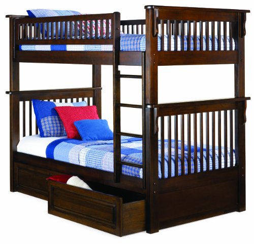 The Colorado Bunk Bed creates an extravagant appearance with curved decorative molding. This super heavy duty bunk bed features 2 by 4-inch posts for rock solid stability. By using hardwoods Atlantic is dedicated to manufacturing in an environmentally responsible manner. Our high build Five Step finishing process produces a superior product surface that is strikingly appealing resisting water damage and scratching. All finishes are proven to be free of lead by stringent independent testing ensuring government safety regulations are surpassed..../ Colorado Twin over Twin Bunk Bed Antique Walnut with Raised Panel Bed Drawers / Twin Bunkbeds